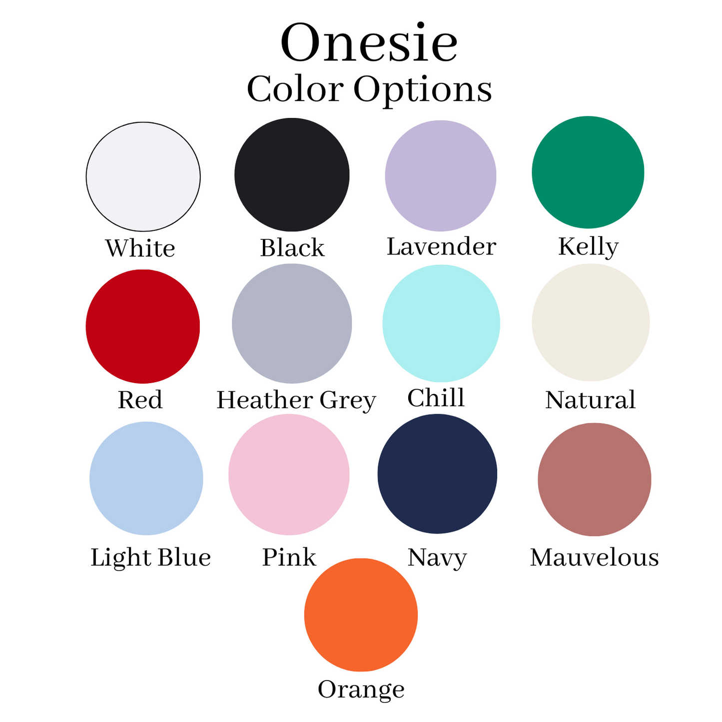 *If you would like the design printed on a different color Onesie, we have many more options to choose from (see color chart). Send us a message and we’ll be happy to make any changes for you. When selecting your onesie and ink color, keep in mind that some combinations may look better than others. For example, black ink is less visible on a dark-colored tee. Enjoy your freedom to select whatever you'd like, but please think about colors and contrast. Happy shopping!
