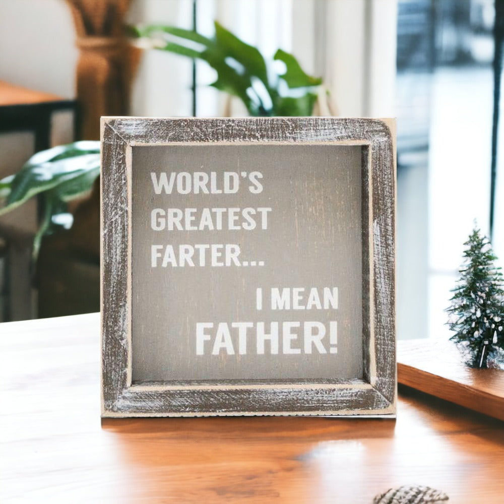 This funny wooden framed sign features distressed colors of gray and white, and boldly displays, "World's Greatest Farter...I Mean Father!" in neat writing.