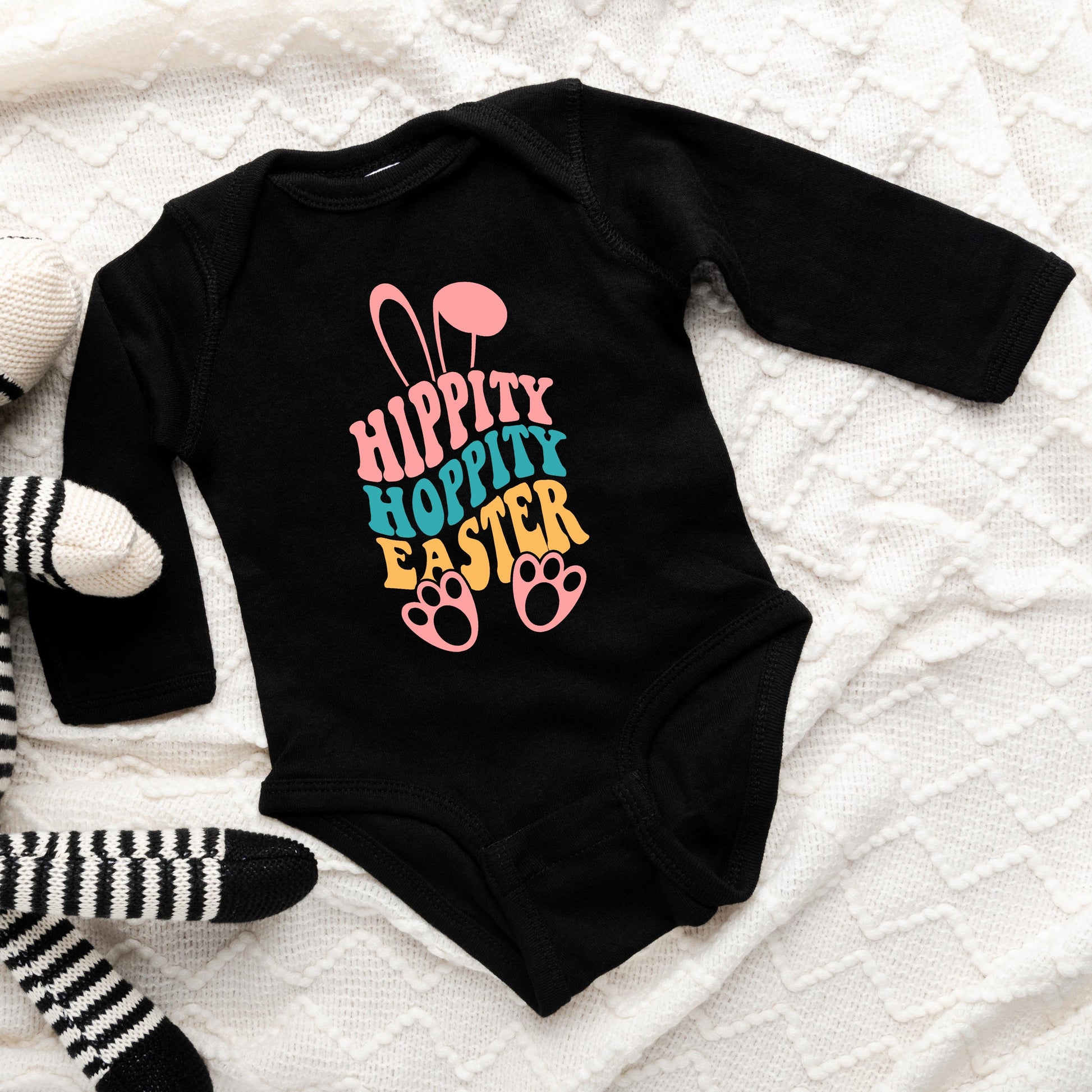 Celebrate Easter in style with this adorable long sleeve baby onesie featuring a fun “Hippity Hoppity” Easter design. Made from soft, breathable fabric to keep your baby comfy all day long.