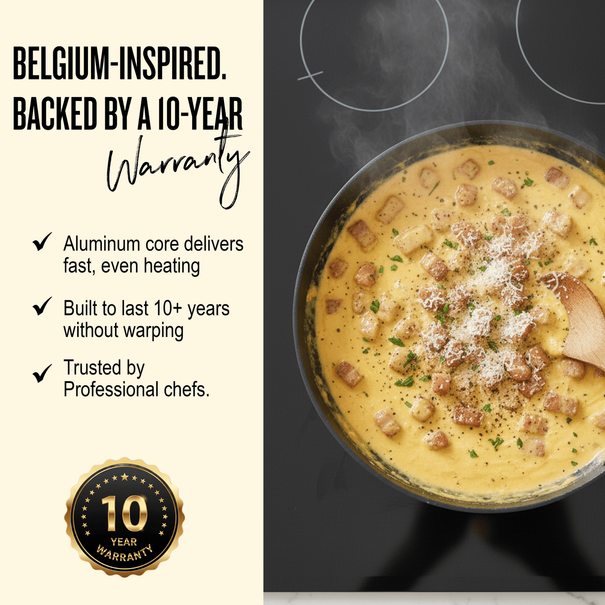 European-designed, toxic-free cookware with even heat and nonstick that actually lasts.