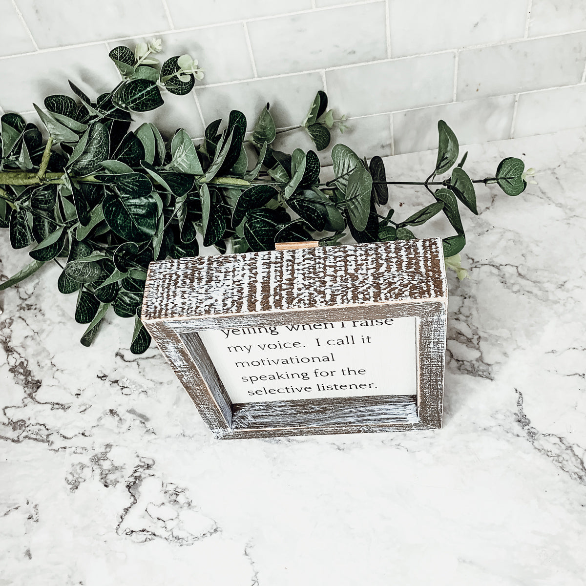 - Reads: "Some call it 'yelling' when I raise my voice. I call it motivational speaking for the selective listener."